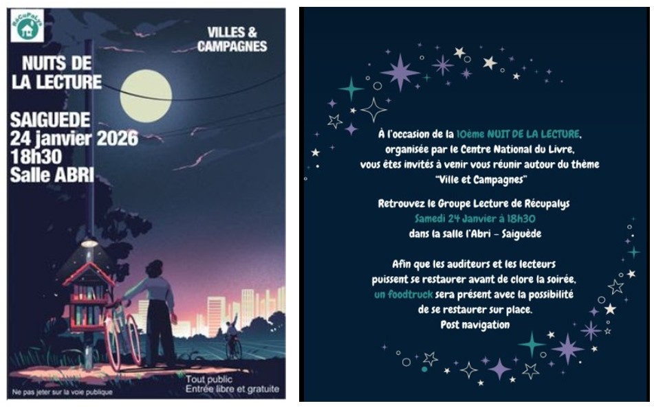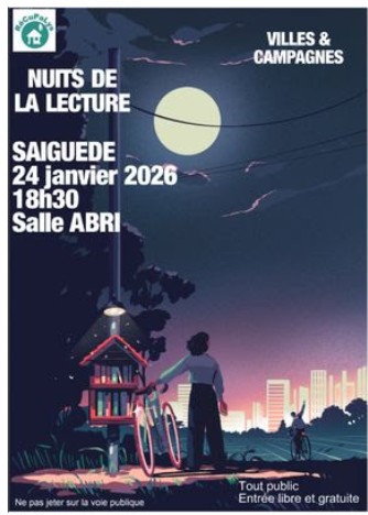 Grand retour du groupe lecture le 24 janvier à 18h30 à la salle l’Abri à Saiguède. Il vous attend nombreux pour cette soirée dans le cadre des nuits de la lecture 2026 : Villes & Campagnes