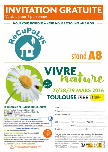 Une nouvelle fois, nous participerons au salon Vivre et Nature les 27, 28 et 29 mars au MEETT de Toulouse
