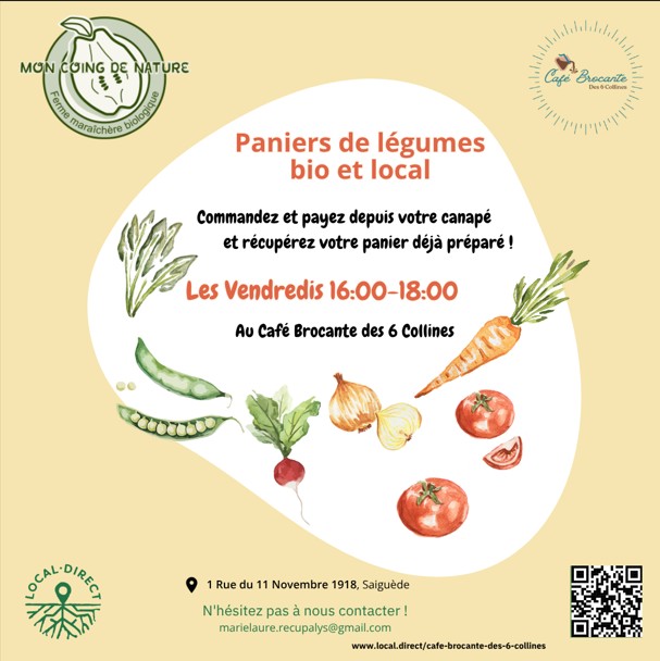 Grâce à notre partenariat avec Mon Coing de Nature et la plateforme Local.bio, vous pouvez désormais récupérer facilement vos légumes frais, locaux et de saison directement au Café Brocante des 6 collines !